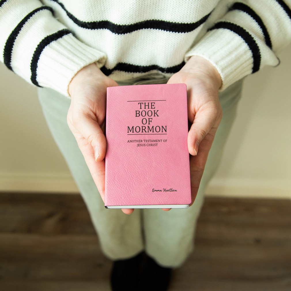 Enjoy beautiful color scriptures at an affordable price with our exclusive line of leatherette covered scriptures. Each combines high-quality, yet economical construction and materials to ensure every member of your family can have a set of scriptures they love. This basic leatherette Book of Mormon features a feminine pink color and black engraving. Leatherette is a type of simulated leather made for custom engraving. Our classic designs and your personalization won't...
