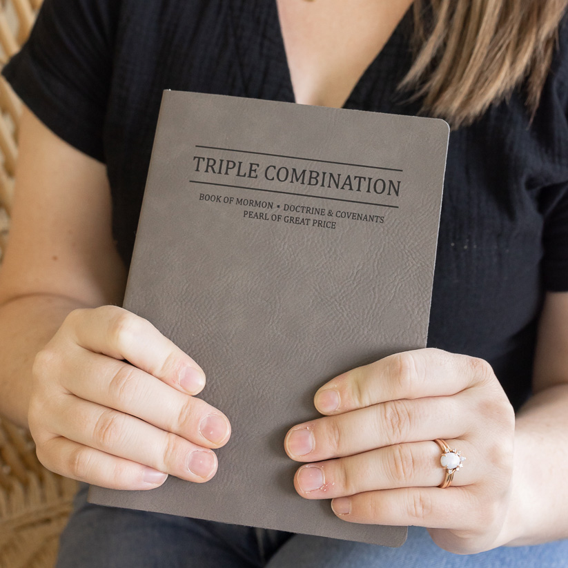 Enjoy beautiful color scriptures at an affordable price with our exclusive line of leatherette covered scriptures. Each combines high-quality, yet economical construction and materials to ensure every member of your family can have a set of scriptures they love. This basic leatherette triple features a modern gray color and black engraving. Leatherette is a type of simulated leather made for custom engraving. Our classic designs and your personalization won't fade or smudge....