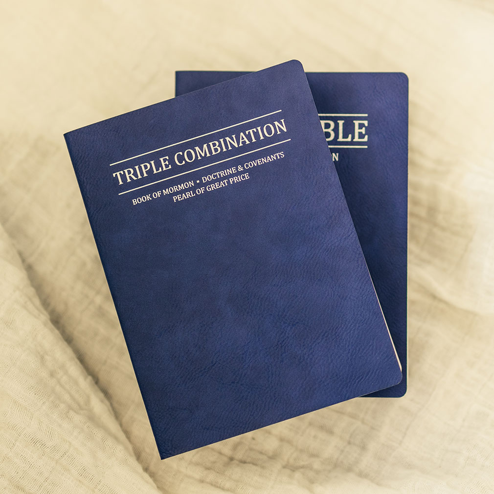 Enjoy beautiful color scriptures at an affordable price with our exclusive line of leatherette covered scriptures. Each combines high-quality, yet economical construction and materials to ensure every member of your family can have a set of scriptures they love. This basic leatherette triple features a classic blue color and silver engraving. Leatherette is a type of simulated leather made for custom engraving. Our classic designs and your personalization won't fade or smudge....