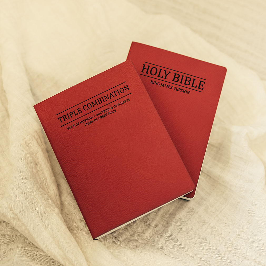 Enjoy beautiful color scriptures at an affordable price with our exclusive line of leatherette covered scriptures. Each combines high-quality, yet economical construction and materials to ensure every member of your family can have a set of scriptures they love. This basic leatherette triple features a classic red color and black engraving. Leatherette is a type of simulated leather made for custom engraving. Our classic designs and your personalization won't fade or smudge....