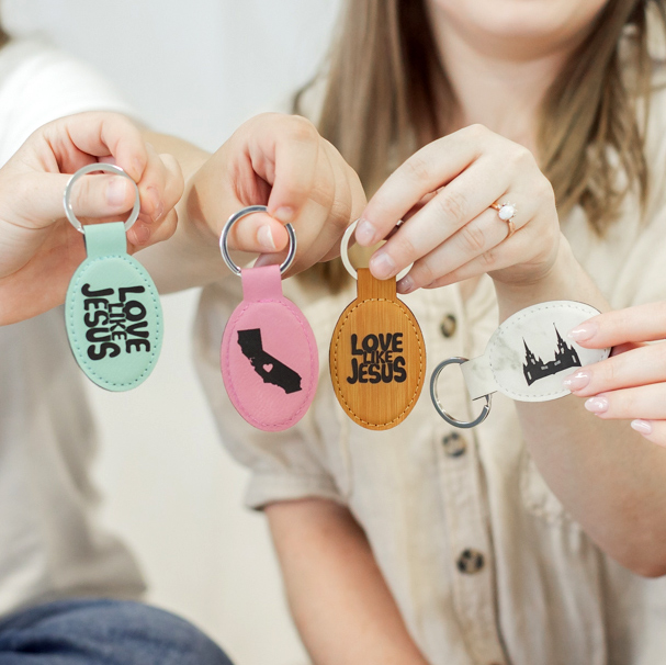 Our leatherette keychain features an elegant love like Jesus design in a variety of colors. The leatherette is soft and comfortable. This makes for a great gift and special keepsake for all ages. Available in the following colors: Bamboo, blue, gray, light brown, marble, pink, red, and teal.