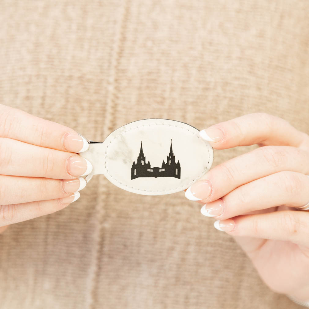 Our leatherette keychain features an elegant temple in a variety of colors. The leatherette is soft and comfortable. This makes for a great gift and special keepsake for all ages. Available in the following colors: Bamboo, blue, gray, light brown, marble, pink, red, and teal. Note: Temple orientation may change depending on temple size.