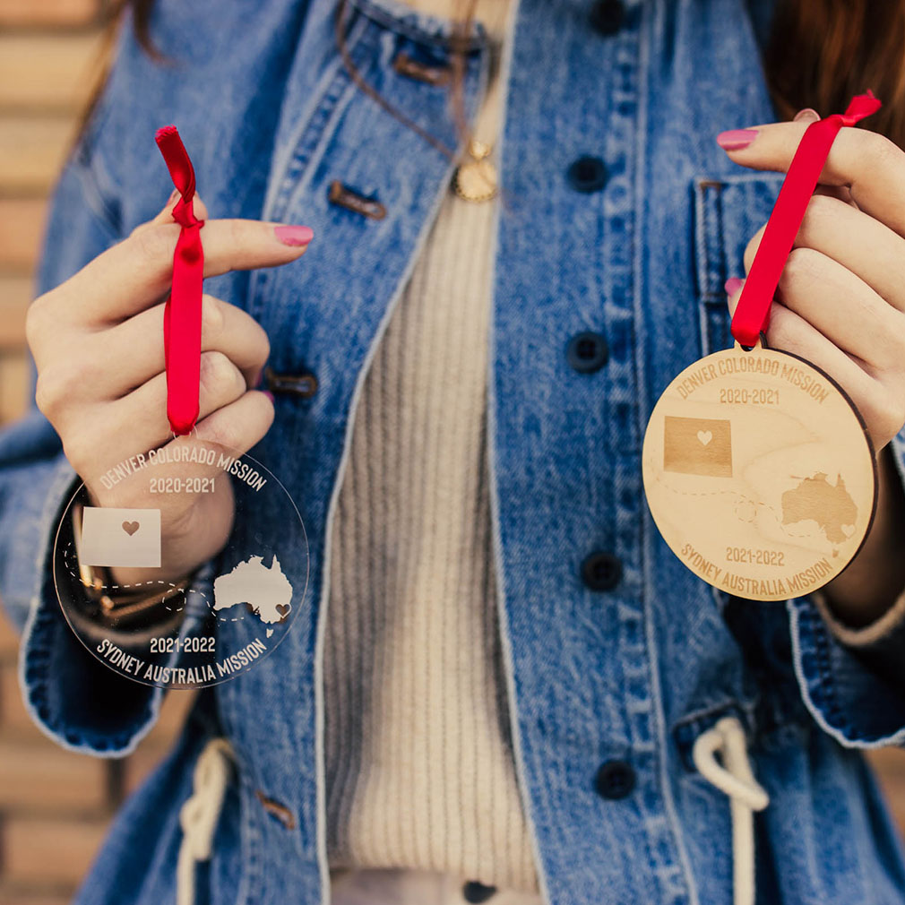 Celebrate your daughter, sister, or friend with this special World Sister Mission Ornament. Each one is made of genuine maple wood and engraved with a globe, a sister missionary, and a tag you can personalize. Add your missionary's name or mission. This ornament measures approximately 3 inches in diameter and comes with a red ribbon. You can also engrave the back as an extra gift.