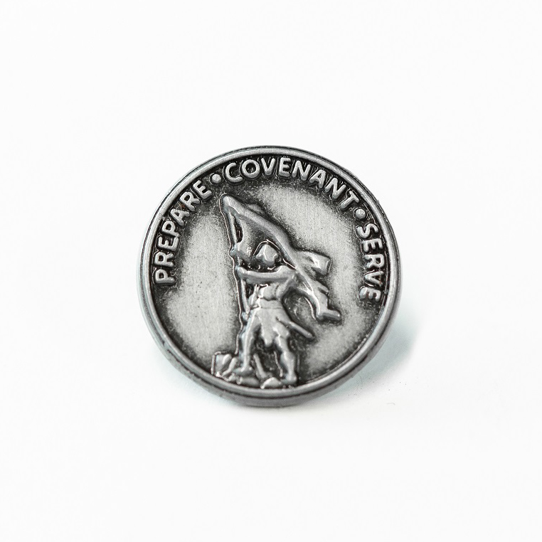One of our bestsellers, the Captain Moroni Tie Tack is a powerful reminder for priesthood holders everywhere. It is made of a metal allow and features an antique silver finish. It is approximately 3/4" in diameter and has the words "Prepare Covenant Serve" on the top of a deception of Captain Moroni hoisting up the Title of Liberty. They make a great individual gift or for your church classes.