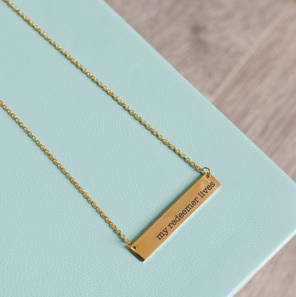 My Redeemer Lives Bar Necklace bar necklace, text bar necklace, gold bar necklace, engraved necklace, my redeemer lives necklace, my redeemer lives