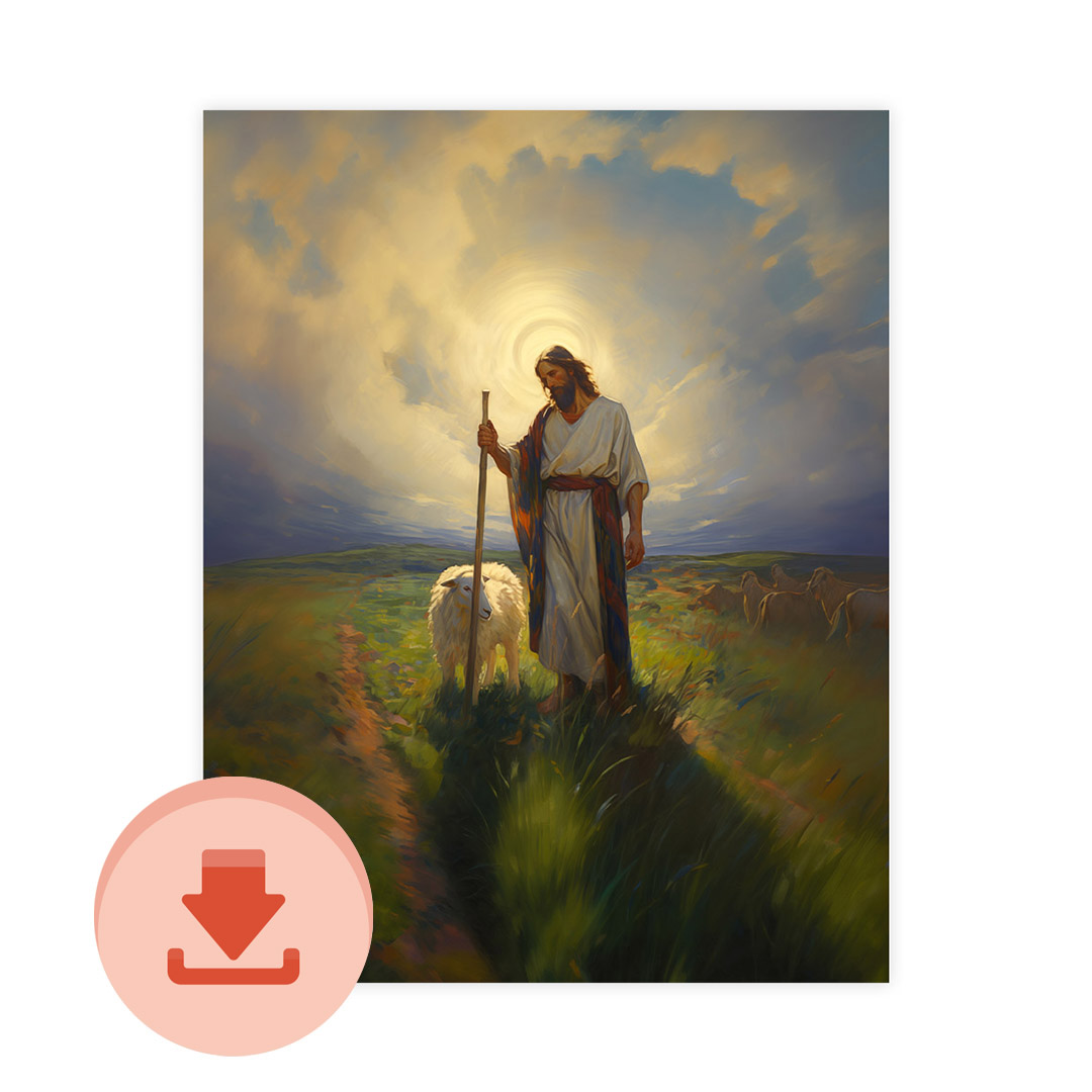 Thy Staff Be My Stay is a sweet depiction of Christ standing with a sheep in a field. It is also available as framed wall art.