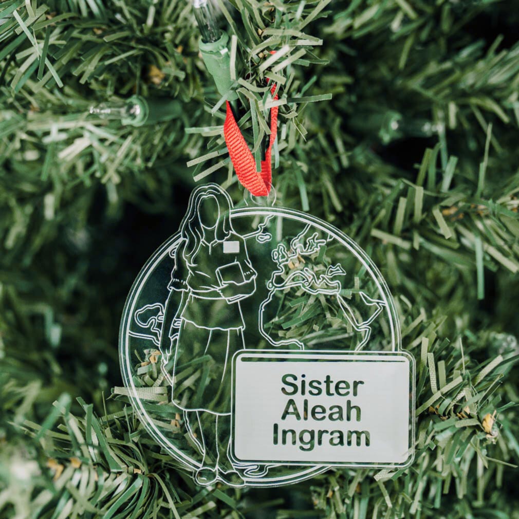 Celebrate your daughter, sister, or friend with this special World Sister Mission Ornament. Each one is made of durable acrylic and engraved with a globe, a sister missionary, and a tag you can personalize. Add your missionary's name or mission. This ornament measures approximately 3 inches in diameter and comes with a red ribbon.